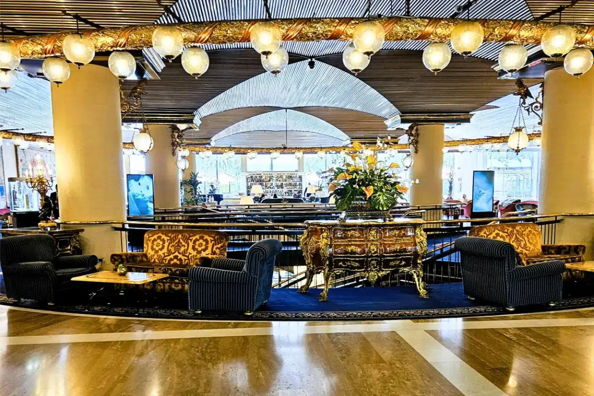 Die Lobby selbst ist wunderschön mit Marmorböden, goldenen Akzenten und ausgefallenen Kunstwerken. Es ist beeindruckend.