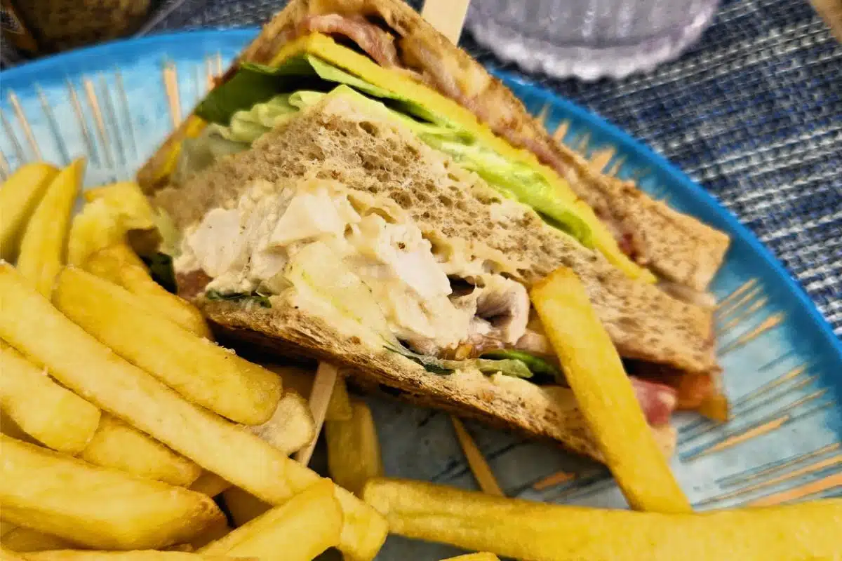 Das Mittagessen am Pool war eine andere Geschichte. Die Speisekarte war einfach, und mein 27-Euro-Club-Sandwich schmeckte gut, aber das Beobachten der Leute machte das wieder wett. Der Poolbereich ist der Ort, an dem du die Mischung der Gäste siehst: Flitterwöchner, Wellness-Reisende, ein paar Kinder und ein paar, die das Pooldeck wie eine Landebahn benutzen.